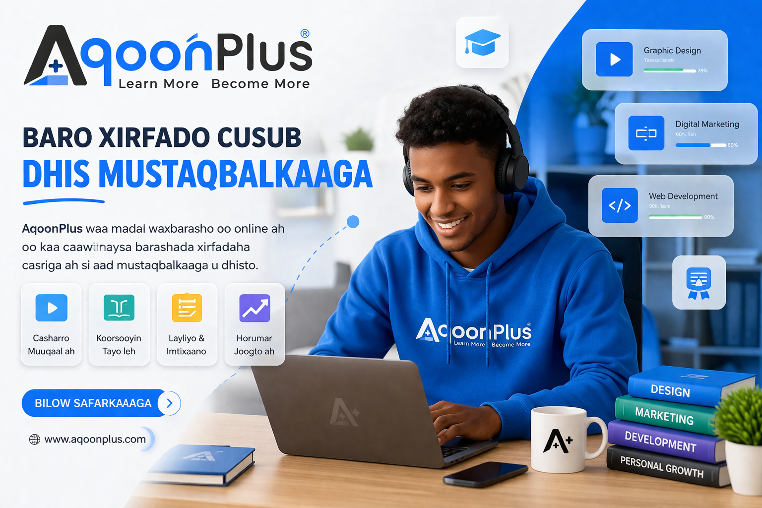 Maanta, dunida si degdeg ah ayey isu beddeleysaa, waxaana sii kordhaya baahida loo qabo xirfado cusub oo la jaanqaadi kara fursadaha casriga ah. Halkaas ayey ka dhalatay AqoonPlus—madal waxbarasho oo loogu talagalay qof kasta oo doonaya inuu horumar sameeyo, wax barto, una diyaargaroobo mustaqbal wanaagsan.